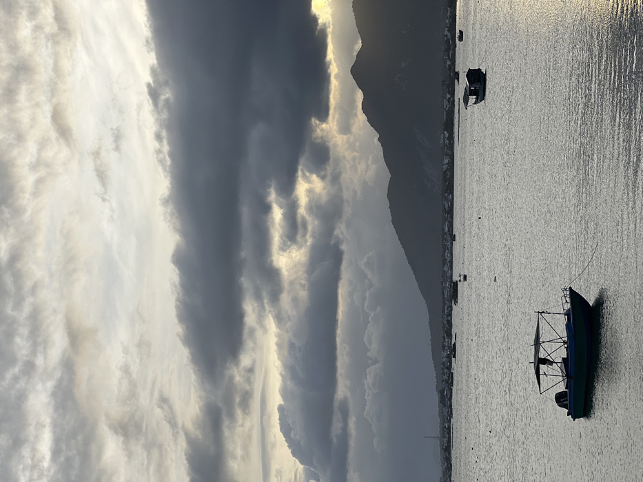The image depicts a wide shot of a body of water within the city of Cam Ranh, Vietnam, likely Cam Ranh Bay, under an overcast sky. The sky is dominated by dense, dark grey clouds, with brighter patches of lighter grey and white visible, particularly along the horizon on the right side where diffuse light filters through. In the mid-ground, a range of dark, silhouetted mountains forms the distant shoreline, with signs of a coastal settlement visible at their base. A tall, slender tower structure is discernible on the far left of the distant land. The water surface is calm, reflecting the subdued light with a silvery-grey hue, showing minor ripples. In the foreground, slightly to the left, a small, dark green or blue-green motorized boat with a light-colored canopy is anchored. An outboard motor is visible at its stern, and a white rope extends from its bow into the water. Further into the mid-ground, towards the right, another small boat with a dark, cabin-like structure is stationary on the water. Several other smaller, less defined boats are scattered across the water in the distance, appearing as dark silhouettes. No individuals are visible on any of the boats or within the visible scene, and no active interactions or movements are depicted. The scene is static and devoid of overt human activity.