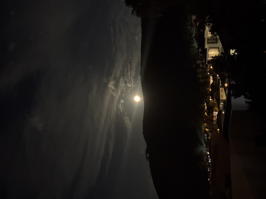 A dark, nighttime landscape with a bright moon illuminating wispy clouds. A dark, silhouetted hill separates the sky from a town or village. Lights from buildings and streetlamps dot the landscape along the right side of the image. The scene has a serene and quiet ambiance. The image is sideways.