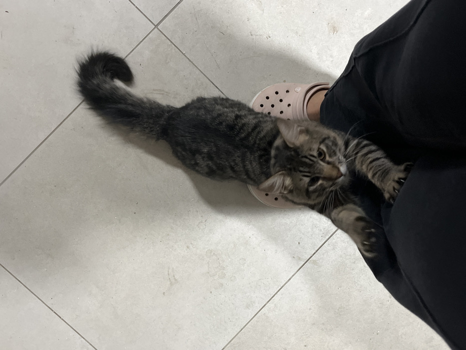 A fluffy, grey-brown tabby cat stretches out on a tiled floor, its tail curled at the end. The cat extends its front paws towards a person wearing black pants and a pink Croc shoe. The cat is close to the person's leg, possibly attempting to climb or play. The floor tiles are large and light-colored.