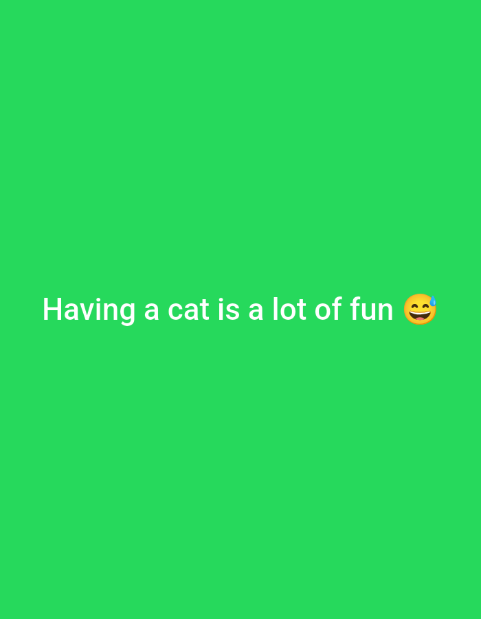 - "A green screen displays the white text "Having a cat is a lot of fun" followed by a slightly sweating smiling face emoji" by FM-b0Aw43, licensed under CC BY 4.0