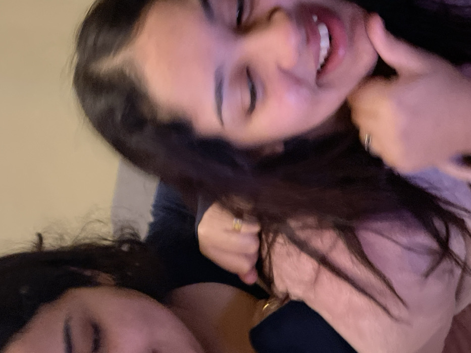 Two women appear in the image. The woman on the right has dark hair and fair skin, with a smile on her face. She is holding her hand near her face. The woman on the left has darker hair and her eyes are closed. The lighting is subdued. The background appears to be a plain wall. It seems the image was captured with a phone camera, resulting in some blur and a slight angle.