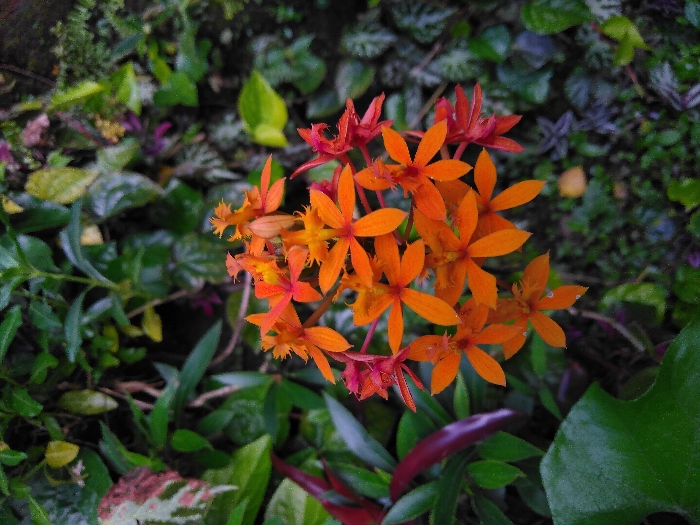 The image displays a detailed close-up of a central cluster of approximately 15-20 small, five-petaled flowers. The flowers are predominantly orange, with some exhibiting reddish-orange coloration, particularly at the edges of the cluster and on developing buds. They are arranged in a dense, roughly circular inflorescence. The background consists of abundant green foliage from various plant species, providing a dense, textured backdrop. Distinct background elements include a large leaf with reddish-brown and pale green variegation visible in the upper-left quadrant and a dark green, broad leaf entering the frame from the lower-left. The surrounding foliage suggests a humid, cultivated botanical environment, consistent with a greenhouse. This scene is located within the Botanical Garden (Botanisk hage) in Oslo, Norway, most likely within one of its tropical greenhouses such as the Palm House or Victoria House.