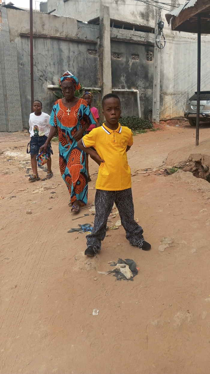 The scene depicts an unpaved street in Obosi, Nigeria, made of reddish-brown earth with visible tire tracks and scattered refuse. Four individuals are present. In the foreground, a boy, approximately 6-8 years old, stands centrally with his hands on his hips, facing the camera directly. He wears a yellow polo shirt with white trim on the collar and cuffs, dark patterned trousers, and black shoes. Directly below him on the ground is a crumpled plastic bag and other debris. Behind and to the left of the boy, an elderly woman, estimated to be 60-70 years old, walks towards the right side of the frame. She wears a vibrant blue and orange patterned traditional dress and a matching headwrap. A prominent silver crucifix necklace is visible around her neck. She wears sandals. To the elderly woman's left and slightly behind her, a second boy, approximately 8-10 years old, walks in the same direction. He is dressed in a white long-sleeved shirt, dark denim shorts with suspenders, and sandals. He carries a small, multi-colored woven bag in his left hand. Partially visible behind the elderly woman's left shoulder is a fourth individual, a child wearing a pink top. The background features a weathered, unpainted concrete building displaying cracks and discoloration. Several small, rectangular openings (possibly vents) are visible on its surface. Electrical wiring and a utility meter are attached to the building. To the far right, a silver SUV is partially visible behind a dark pole and a structure with a corrugated metal roof. Sparse green foliage grows at the base of the concrete wall.