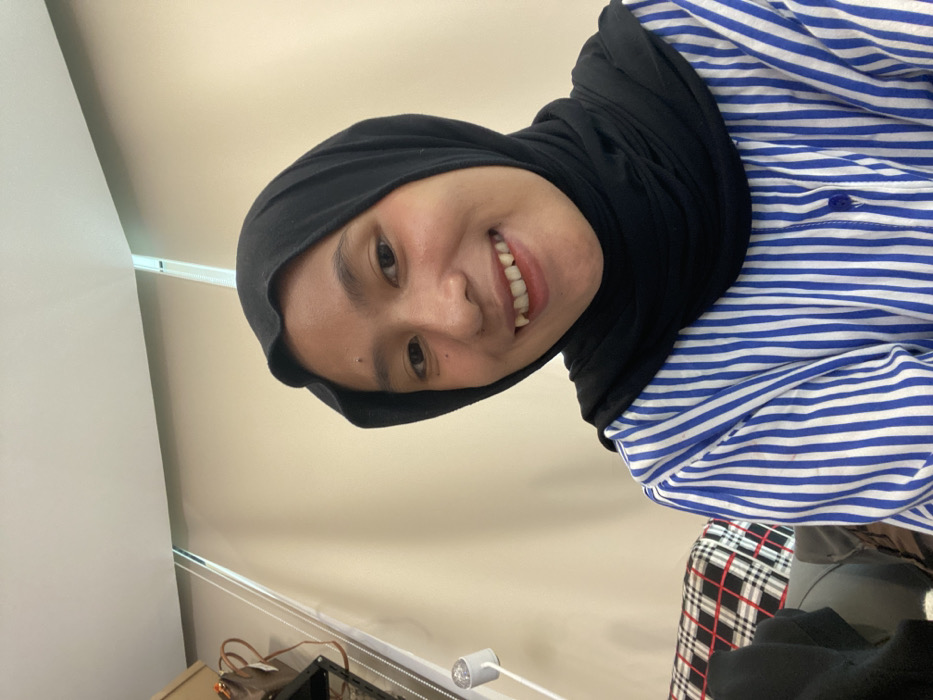 A smiling person wearing a black hijab and a blue and white striped shirt is shown in a close-up shot