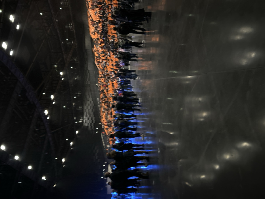 An indoor venue features rows of orange seating filled with people. A line of individuals stands on a dark, reflective surface, their forms blurred and illuminated by a blue light. Above, a high ceiling is visible, structured with metal beams and dotted with evenly spaced lights. The lighting casts elongated reflections on the shiny floor. The image has a strong vertical orientation.