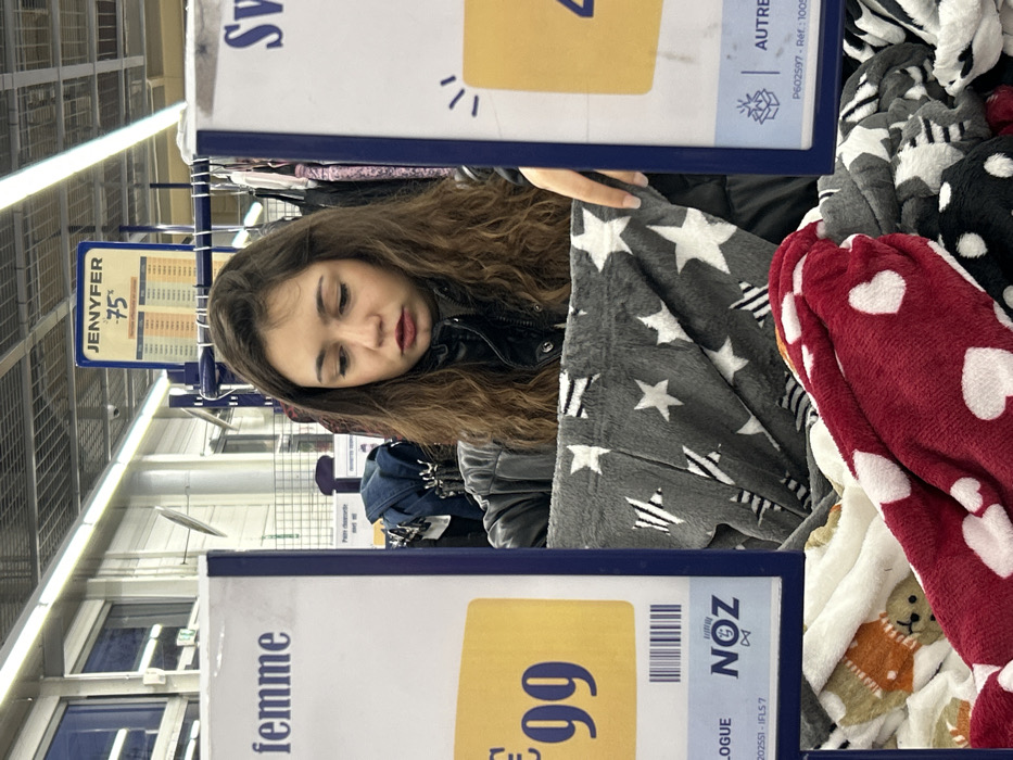 A young woman with long, curly brown hair is shopping in a store. She's wearing a black jacket and appears to be looking at a pile of cozy blankets with star and heart patterns. Price signs with "femme €9.99" and "JENYFER €75" are visible, indicating the location is a clothing or department store. The background shows clothing racks and store lighting.