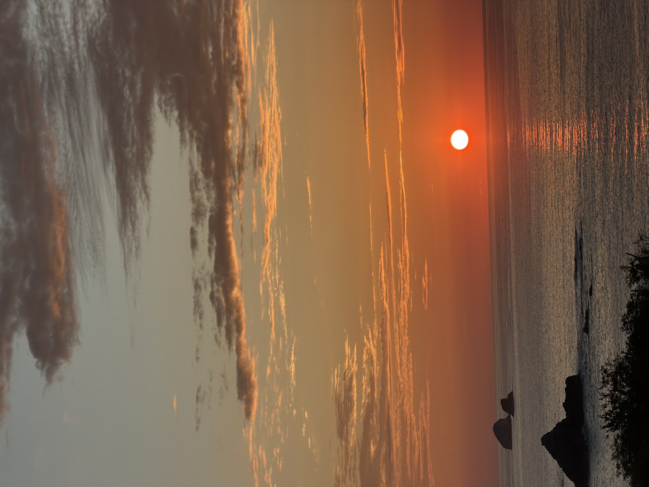 The image depicts an ocean sunset in Unknown, Mexico. The sky exhibits a gradient from pale blue-grey at the top to intense orange and deep red at the horizon, populated by multiple layers of stratified clouds, including dark, wispy formations with orange undersides. A bright, white, circular sun is positioned low on the horizon, approximately one-third from the right edge of the frame, casting a distinct, shimmering orange-red reflection vertically across the ocean surface. The water is a dark blue-grey, appearing relatively calm with subtle ripples, particularly within the sun's reflection. In the mid-ground, two dark, rounded rocky islets are silhouetted against the water on the left side. Closer to the foreground on the left, a larger, jagged, dark rock formation is partially visible, protruding from the water. The extreme bottom edge of the image reveals the silhouette of dark, indistinct vegetation, likely bushes or small trees. No human figures, animals, or man-made structures are visible.