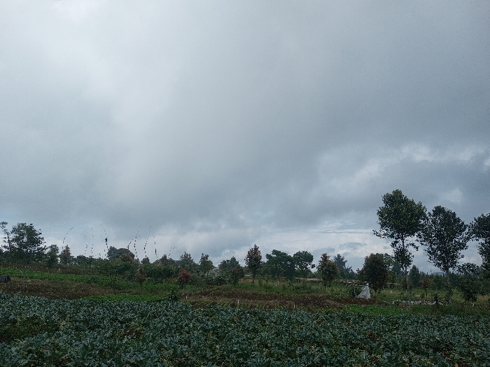 A landscape under a vast, cloudy sky shows a field of green, leafy plants in the foreground. Behind the field, a varied collection of trees and shrubs line the horizon. Some appear to be young trees, interspersed with taller, more mature trees with dense foliage. A hint of fog or mist can be seen in the distance, partially obscuring the view. The overall scene evokes a sense of rural tranquility under a somewhat overcast sky.