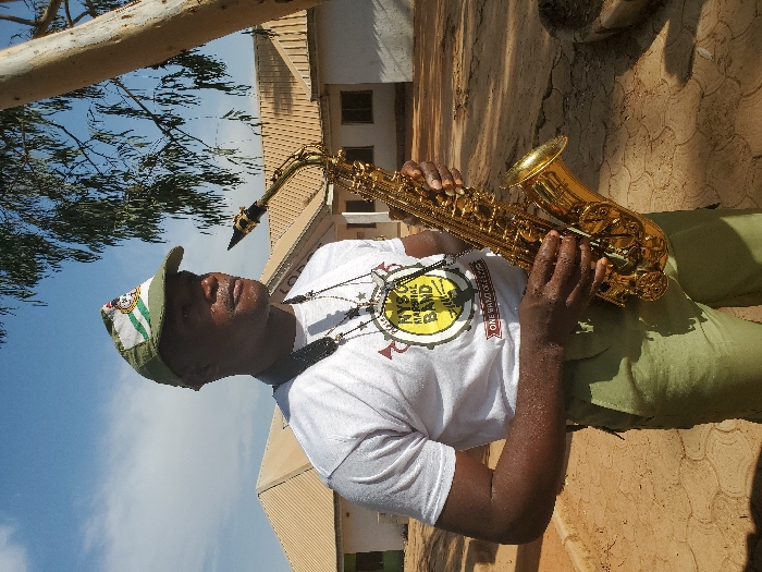A dark-skinned male subject is depicted outdoors in a vertical, waist-up composition under a clear blue sky with scattered white clouds. He wears a green and white NYSC (National Youth Service Corps) cap, featuring the Nigerian coat of arms emblem. His attire includes a white t-shirt with a yellow circular logo reading "NYSC MARSHAL BAND" and the text "ONE BAND ONE VOICE" below it, paired with olive green trousers. A black neck strap is visible around his neck, supporting a golden alto saxophone that he holds with both hands, positioned on its keys. Multiple necklaces with various pendants, including star shapes, are worn around his neck. His gaze is directed towards the upper right of the frame. In the background, a light brown/tan hip-roofed building is visible, featuring partially discernible text on its facade, possibly "LOFT". A second, similar building is situated further behind. The ground consists of light brown, dusty soil with visible paving patterns. A pale tree trunk with green foliage is present on the right side of the image. The scene is consistent with an institutional or camp-like environment, specifically the NYSC Permanent Orientation Camp in Mangu, Plateau State, which serves the Jos, Nigeria region.