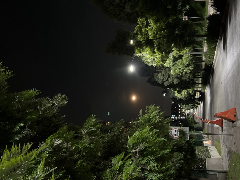 A nighttime street scene featuring a road illuminated by streetlights, lined with trees and foliage. In the distance, city buildings are visible under a pale moon. Roadside barriers are present near the bottom, and a street sign is visible. The perspective is slightly skewed, emphasizing the height of the trees and the depth of the road.