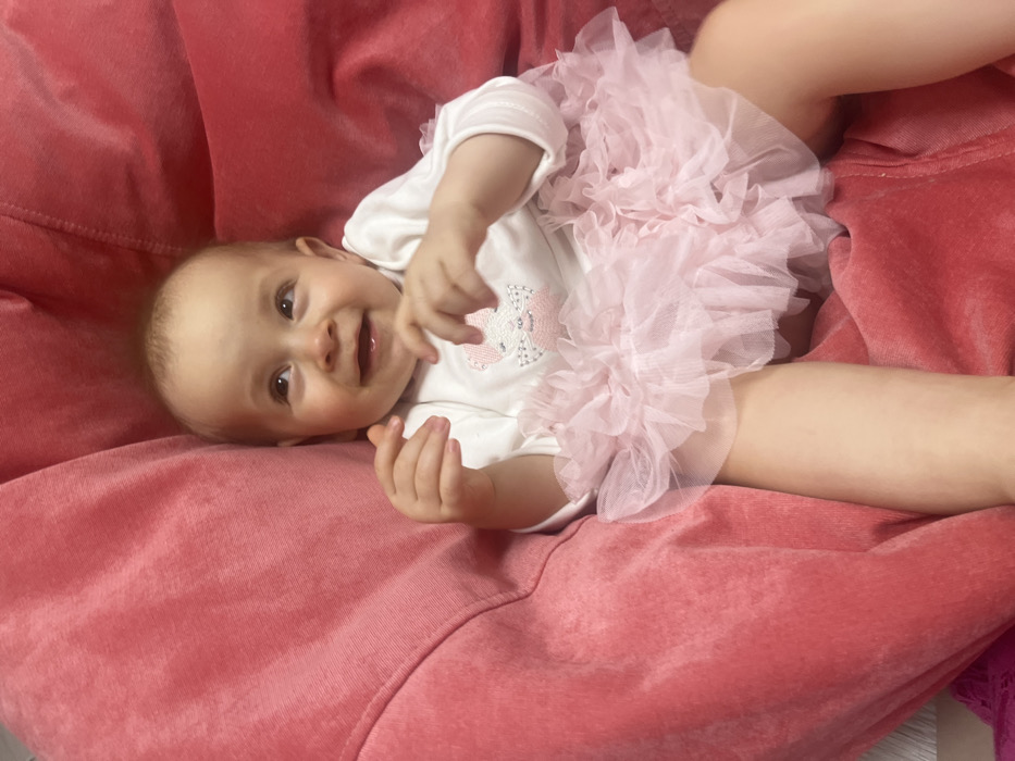- "A baby girl in a white long-sleeved onesie with a pink tulle tutu lies on a large, plush, pink beanbag chair" by FM-v5Wx12, licensed under CC BY 4.0