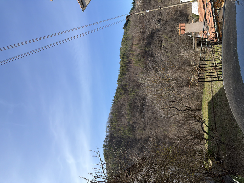 This image displays a daytime view of a mountainous, semi-rural landscape in Taran, Bulgaria. The background is dominated by a large mountain slope, densely covered with dark green coniferous trees in its upper sections. The lower and mid-slopes feature numerous bare deciduous trees, indicating a season like late winter or early spring. The sky above is clear and bright blue with some faint, wispy white clouds. In the mid-ground, a grassy, gently sloping area with patches of dry brown grass and several bare trees extends from the left toward the center. A black metal fence with decorative scrollwork is visible in the lower right, separating the grassy area from a property. This property includes a building with a reddish-brown tiled roof and a prominent, light-colored chimney stack capped with terra cotta. A wooden utility pole extends vertically from the right edge of the frame, with at least three parallel power lines stretching horizontally across the upper right portion of the sky. The dark, reflective surface of a vehicle's roof is partially visible at the very bottom center of the frame. No people or animals are present, and no specific actions or interactions are depicted.