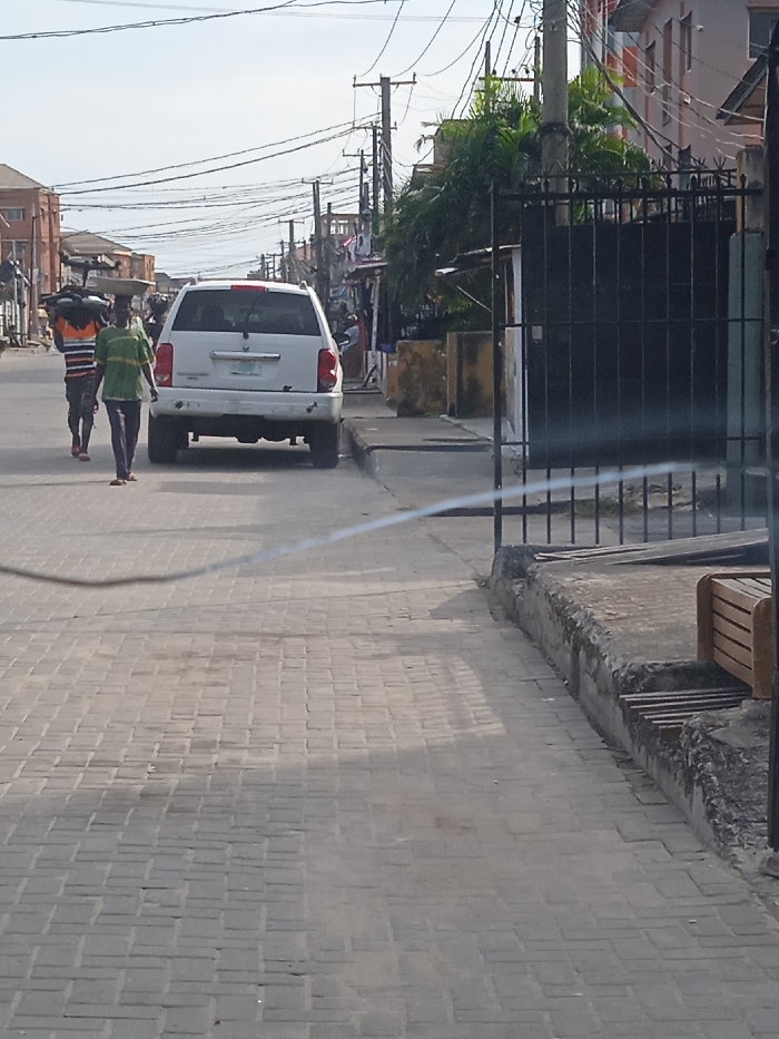 The image displays an urban street scene in Agani, Nigeria, captured during daylight hours. A paved road, constructed from rectangular grey interlocking blocks, occupies the central and foreground areas. A white SUV is positioned centrally on the road, visible from its rear, facing away from the viewer. Its license plate details are not discernible. Two male individuals are walking on the left side of the road, moving in the same direction as the SUV. The person closer to the viewer wears a light green short-sleeved shirt and dark trousers, with dark footwear or barefoot. The individual further back wears a striped shirt (orange, black, white) and dark trousers, carrying a large, dark, flat object on their head, resembling a tray, and a dark bag or object suspended from their left shoulder. To the immediate right of the road, a concrete sidewalk with a dark curb separates the roadway from a property. This property is secured by a black metal fence or gate featuring vertical bars and decorative elements. A wooden slatted bench is partially visible behind this fence. A thin, light-colored horizontal line, possibly a cable, traverses the lower-mid section of the image, diagonally from left to right, passing in front of the metal gate. The background on both sides of the street features multiple buildings, predominantly two-story structures, appearing to be residential or commercial. The buildings on the far right exhibit varying paint colors. Numerous dark utility poles support a dense network of overhead utility wires that crisscross against a bright, hazy sky. Green foliage is visible behind the right-side fence. Shadows are cast on the paved road, consistent with sunlight from an elevated source. Distant figures and structures, possibly market stalls, are discernible along the right side of the street further down.