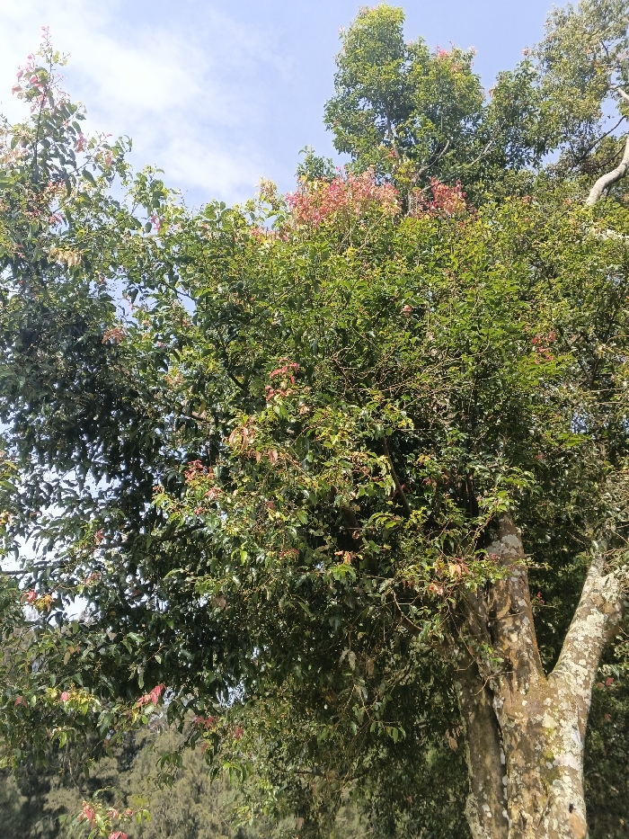 The image displays a large tree or a cluster of trees, situated in San Gregorio de Polanco, Uruguay, set against a clear blue sky with sparse white clouds. The tree canopy is dense, composed primarily of dark and medium green leaves. Throughout the foliage, particularly at the top and distributed within the branches, are visible areas of light green, yellowish-green, and distinct pink to reddish new growth or blossoms. On the right side of the frame, a prominent tree trunk, characterized by light brown and gray bark, shows noticeable texture and patches of white and light green lichen or moss, branching upwards and to the right. The background consists of a dense, darker green expanse of foliage from other trees. No individuals, animals, specific human actions, or man-made structures are discernible within the frame.