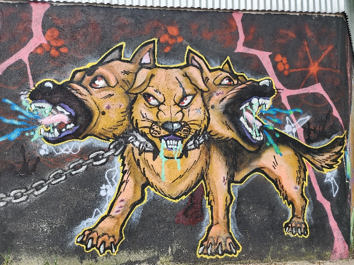 Graffiti art depicts a three-headed dog, likely inspired by Cerberus, the guardian of the underworld