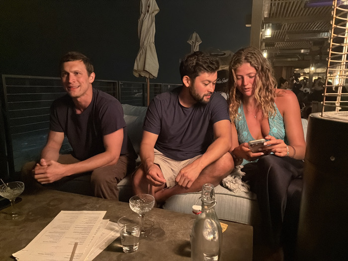 The image displays an outdoor patio scene at night at Malibu Farm, located in Malibu, California, United States of America. Three individuals are seated on a light-colored lounge sofa around a dark-colored table. From left to right: an adult male with short dark hair, wearing a dark blue t-shirt and brown trousers, smiles towards the viewer with clasped hands. Next to him, a second adult male with a dark beard, wearing a dark blue t-shirt and light shorts, looks down at a smartphone. The third individual, an adult female with long wavy light brown hair, wearing a light blue sequined halter top and dark trousers, holds a silver-colored smartphone with both hands, focused on its screen. On the table, several white menu sheets are stacked alongside two empty coupe-style cocktail glasses, a glass of water, and a clear glass bottle of water with a swing-top lid. In the background, a dark metal railing overlooks dark water. Two closed outdoor umbrellas and a dark patio heater are visible, with distant artificial lighting suggesting further activity. The scene is illuminated by warm artificial light, indicating nighttime.