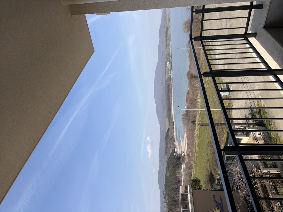 The image depicts a panoramic view from an elevated balcony overlooking the coastal landscape of Ahtopol, Bulgaria, under clear daylight conditions