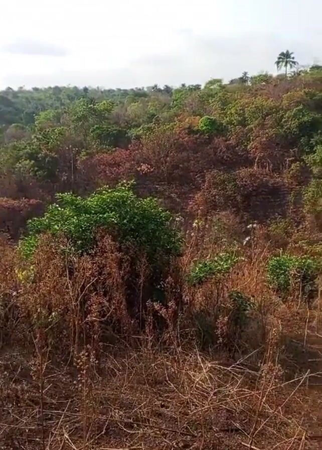 The camera is pointed at a wooded landscape on a hill. The foreground features dry, brown vegetation, interspersed with some green bushes. Moving up the hill, the vegetation becomes denser, with a mix of green and brown trees and shrubs. At the peak of the hill, there is a single palm tree visible against a slightly overcast sky. The day appears to be sunny. The landscape presents a blend of dry and greener vegetation, typical of a transitional or seasonally changing environment.