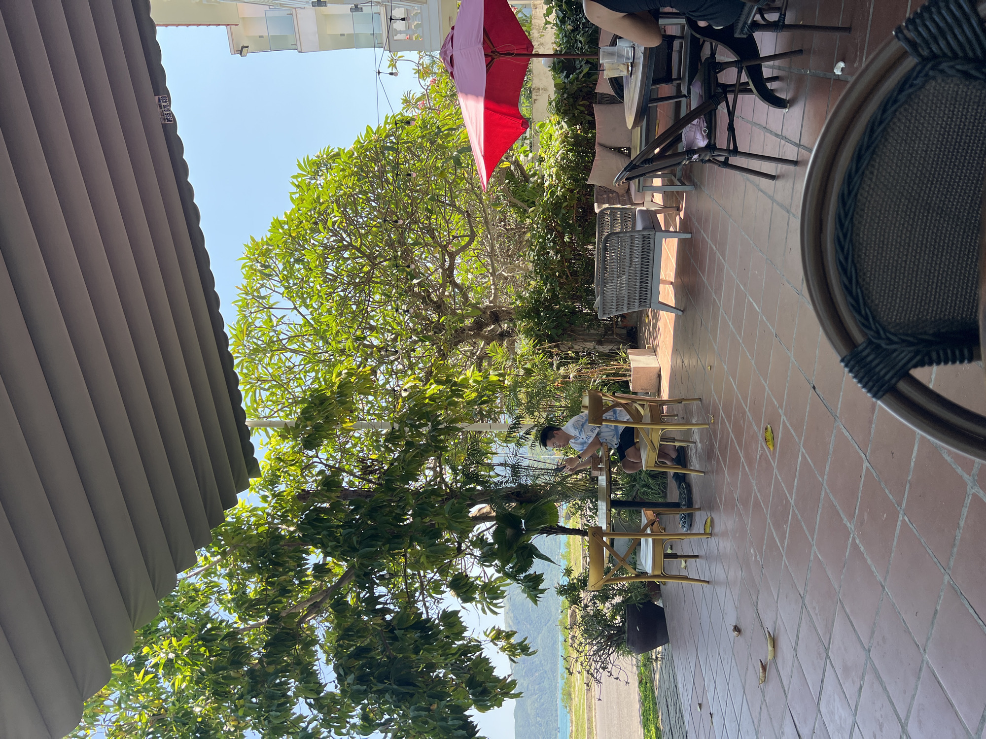 An outdoor cafe terrace in Nha Trang, Vietnam, is depicted on a clear, sunny day. The scene is observed from a slightly elevated perspective, looking towards the sea and distant mountains. A large, grey retractable awning extends over the seating area. In the foreground, the back of a dark brown wicker chair is visible. The floor is tiled with reddish-brown square tiles, with scattered yellow and brown leaves. Towards the left, a young adult male, wearing a light blue and white patterned short-sleeved shirt and dark shorts, sits at a small round table with two light-colored wooden chairs with cross-backs. He is actively looking at a smartphone held in both hands. A dark drink glass is on his table. Behind him, lush green trees and potted plants line a paved road. Beyond the road, a body of water (likely the sea) with a distant coastline and mountains is visible under a clear blue sky. Further into the terrace, towards the right, another section of seating includes a grey wicker bench with light cushions, and a few dark-colored wicker chairs around a round wooden table. A bright red market umbrella provides shade over this area. On the table, multiple glasses are present, and the upper back and shoulder of a person wearing a dark top are partially visible on the right edge. String lights are strung between trees and the adjacent building. The building in the background to the far right is a light-colored multi-story structure with balconies featuring glass railings. Overhead, a small white rectangular sign with the black text "0935.678.439" is attached to the underside of the awning.