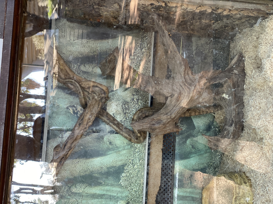 A glass enclosure contains a textured backdrop with green and beige hues. Two pieces of driftwood, weathered and brown, are positioned in the foreground. One is on the left side and is oriented diagonally while the other is on the right side with the base in the center and going up. The top of the enclosure has a tan mulch-like substrate. Reflections on the glass surface obscure portions of the scene.