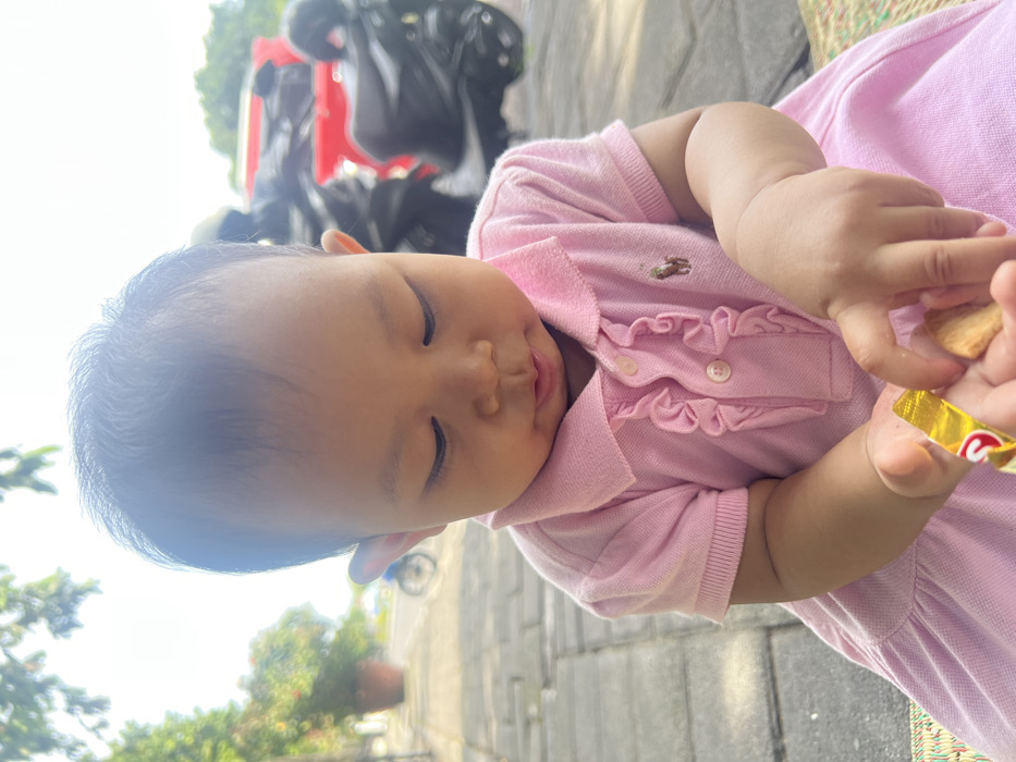 A baby wearing a pink shirt is lying down. The baby is holding a cracker in its right hand. There is a gold and yellow wrapper in the baby's hand as well. Behind the baby, there is a parked motorcycle and a green leafy tree. The baby is lying on a woven mat or blanket.