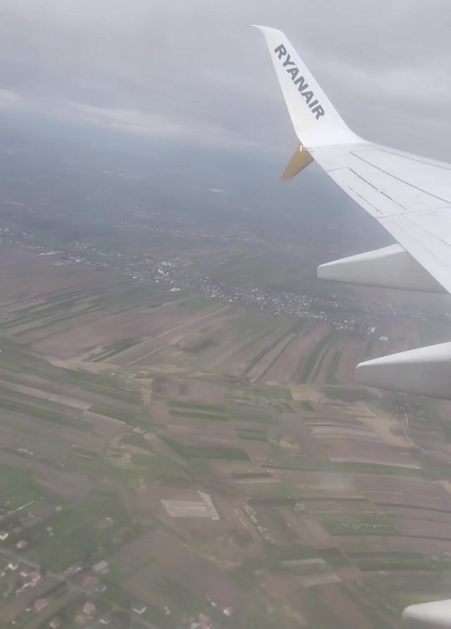 The view from an airplane shows a wing with the "Ryanair" logo and land below