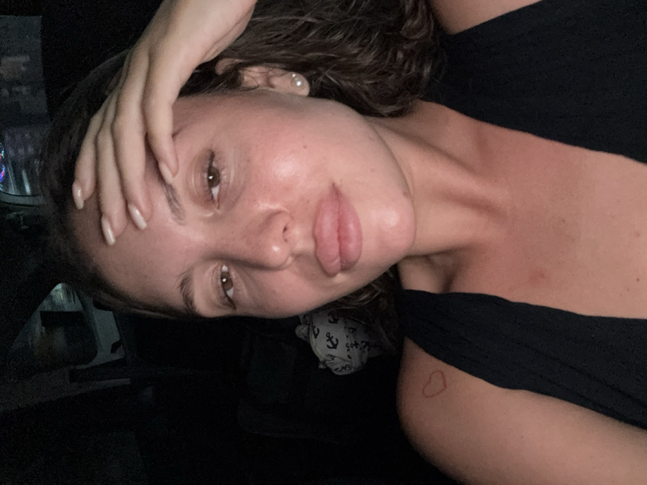 A close-up, frontal photograph captures a female subject, approximately mid-20s to early 30s, inside a dimly lit environment, likely a vehicle at night