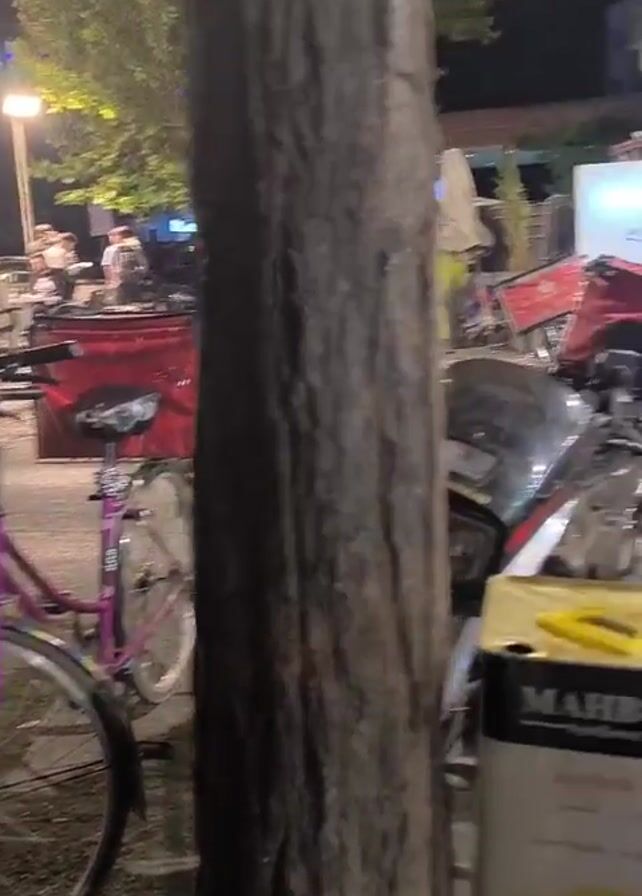 street scene at night. There's a bicycle with a delivery box and a basket parked beside a tree. Nearby, a motorbike is parked, next to a large can of "MAHBUBA" sunflower oil. A man is sitting on the motorcycle, looking at his phone. In the background, several people are standing and walking around in front of shops with signs written in Arabic. String lights are visible above the shops. There are other motorcycles and bikes parked in the area.