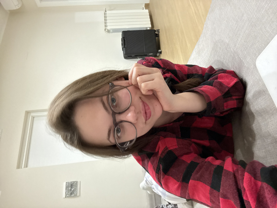 This indoor scene, reportedly located in Scafati, Italy, depicts a female subject lying prone on a grey upholstered surface. The subject has medium-length brown hair and wears dark-rimmed glasses along with a red and black plaid button-up shirt. She is propped on her left elbow, with her right hand resting under her chin, and gazes directly forward towards the camera with a slight smile. The background features light-colored walls, a white interior door, and light wood flooring. To the right, a white wall-mounted radiator is visible, positioned next to a dark-colored, four-wheeled hard-shell suitcase. A small, rectangular, reflective silver art piece is mounted on the wall to the left of the door. A portion of a white electronic device is partially visible in the lower right foreground.