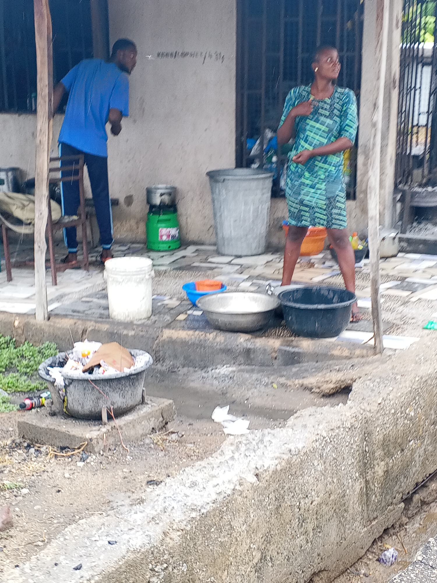 The image depicts a scene in Lokoja, Nigeria. In the foreground, a concrete drainage ditch separates the viewer from the main area of activity. A large, dark grey tub overflowing with trash sits on a concrete block on the near side of the ditch. Behind the ditch, on a paved area, are two adults. One man in a blue shirt and dark pants is standing on a wooden chair leaning into the wall. A woman in a blue and green patterned dress is standing with bare legs in front of the entrance to a building. Several metal bowls and plastic containers are arranged on the paved surface. A large silver trash can is behind her and she is standing next to a wooden post. A green gas canister is visible further back, against a beige wall. The background reveals a building with barred windows.