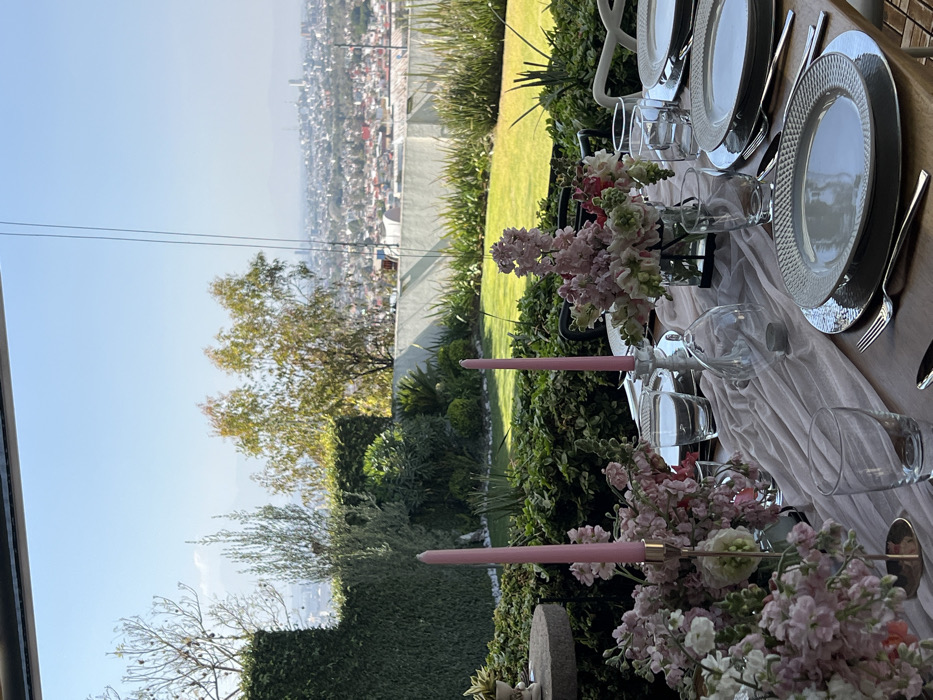 An outdoor table is set for a formal meal, adorned with silver-rimmed plates, elegant glassware, and floral centerpieces featuring pink and white blooms. Soft, pale pink candles add a romantic touch to the setting. A sheer, pale runner flows down the table's center. Lush greenery and a distant cityscape are visible in the background, suggesting a scenic location for the event.