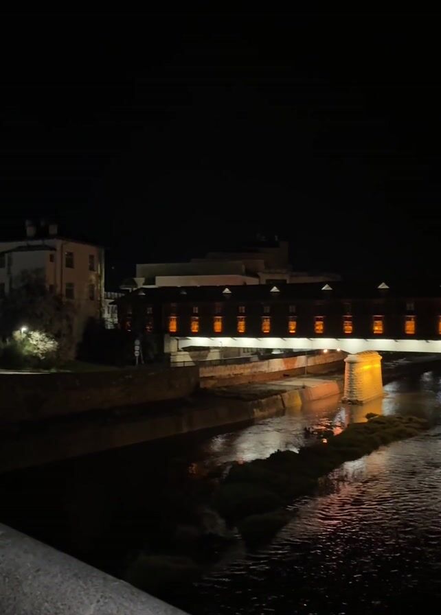 night scene of a river running under a long, covered bridge