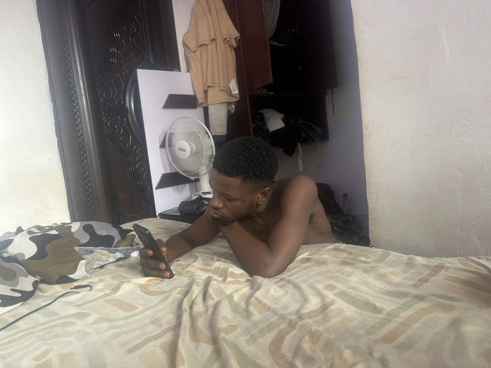 A male individual is observed lying prone on a bed in what appears to be a bedroom located in Nnewi, Nigeria