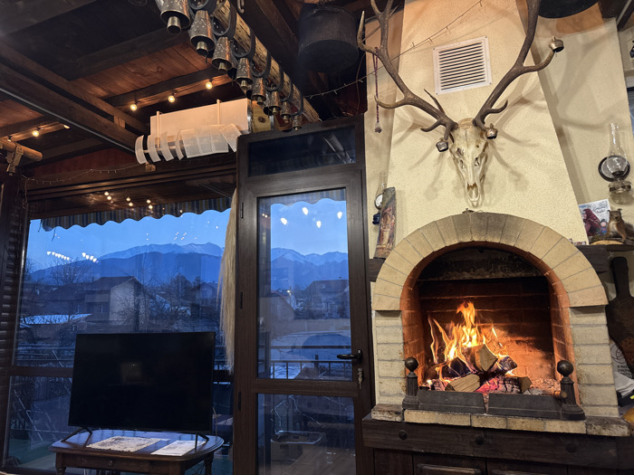 The image presents an interior scene overlooking the city of Razlog, Bulgaria, during twilight or dawn. A large, dark-framed glass window on the left reveals a vista of snow-capped mountains against a deep blue sky, with residential buildings and bare trees in the urban foreground. A dark metal balcony railing is visible directly outside the window. The room features a dark wooden ceiling with exposed beams. A string of small, warm-toned bulbs runs along the top window frame. A series of metallic bells, varying in size, are suspended from a horizontal wooden beam near the ceiling. A white, ribbed rectangular unit is mounted on an adjacent wooden beam. A tall, dark wooden door with glass panels is centrally positioned, reflecting the outdoor scene. In the lower left, a dark flat-screen television rests on a small, dark wooden table with curved legs. A light-colored sheet of paper is visible on the tabletop beneath the television. On the right side of the image, a brick fireplace with an arched opening contains a burning fire with active flames and visible logs, held by a dark metal grate. Above the fireplace, mounted on a beige wall, is a large animal skull with prominent antlers, from which small bells are suspended. A white rectangular ventilation grate is located above the skull. A dark wooden shelf to the right of the fireplace holds an antique oil lamp and a small, reddish-brown animal figurine resembling a fox, alongside other indistinct objects. A small, framed image or icon is affixed to the wall to the left of the fireplace. No individuals are present in the scene.