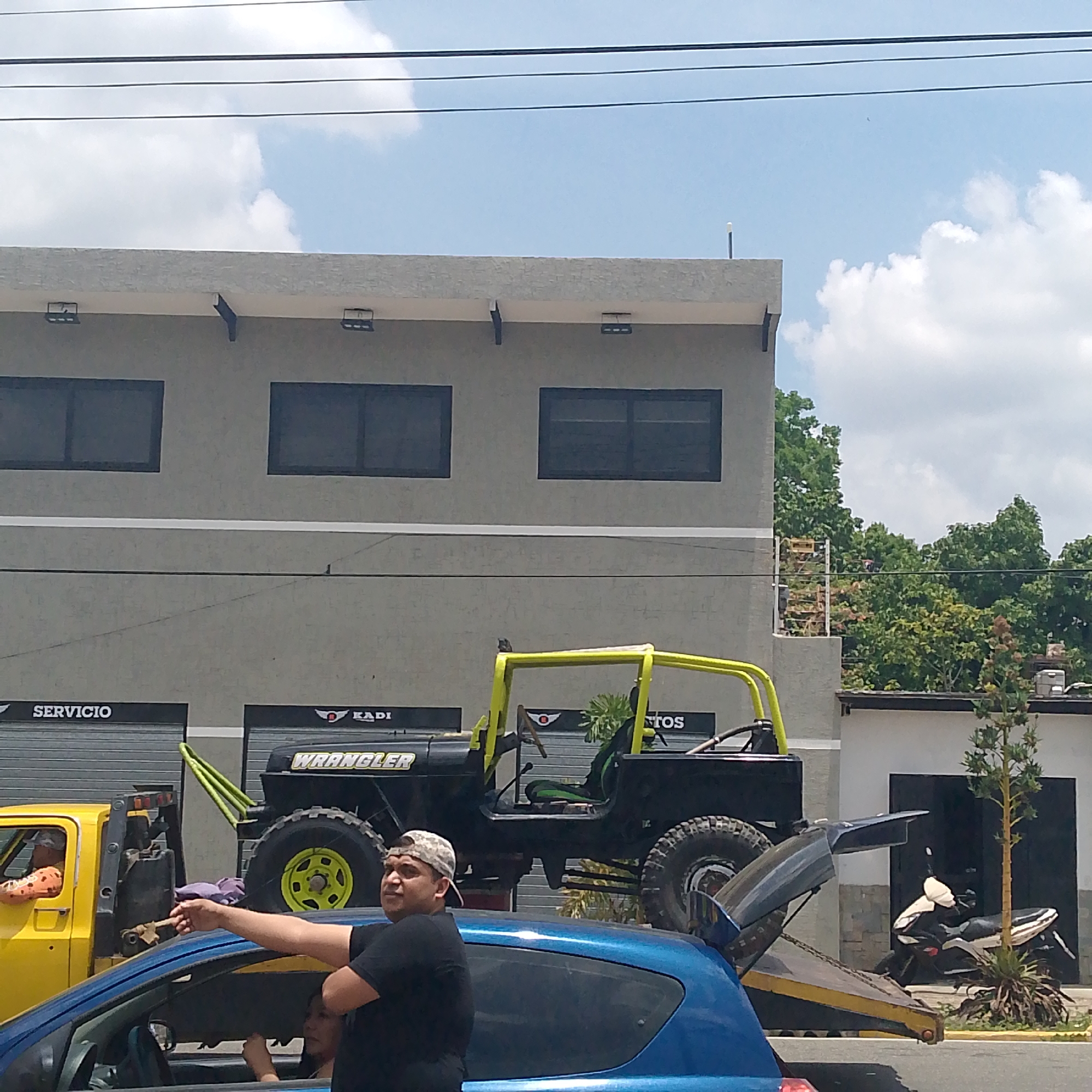 A man in a black t-shirt and camouflage baseball cap points to the left side of the image, towards a yellow tow truck holding a black Jeep Wrangler with a yellow roll cage. The man is standing next to a blue car. The scene is taking place outside a building with closed roller doors that are painted grey. The writing on the doors reads "SERVICIO" and "KADI" and "SANTOS". A motorcycle sits near the rear of the truck on the street level. The location is Tinaquillo, Venezuela.