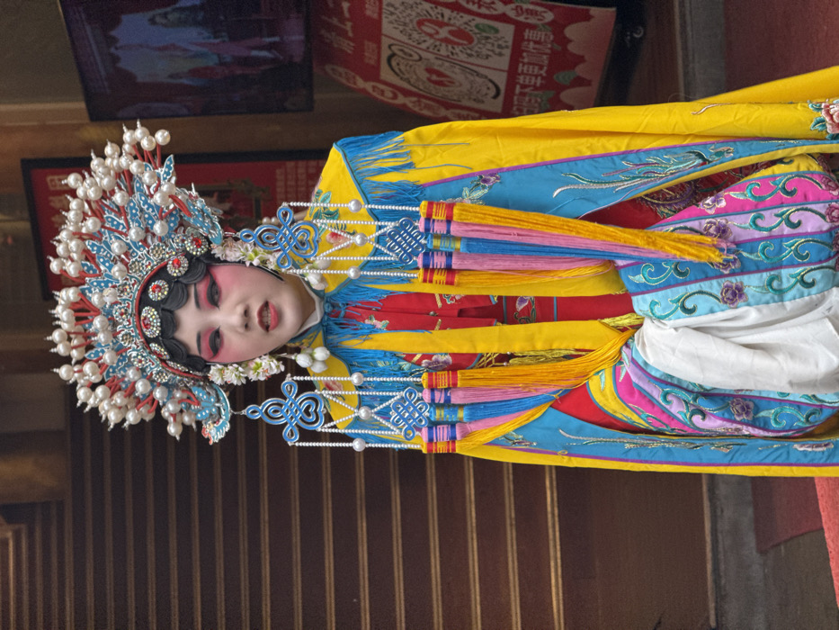 A performer in elaborate Chinese opera attire stands out with striking makeup and a heavily adorned headdress