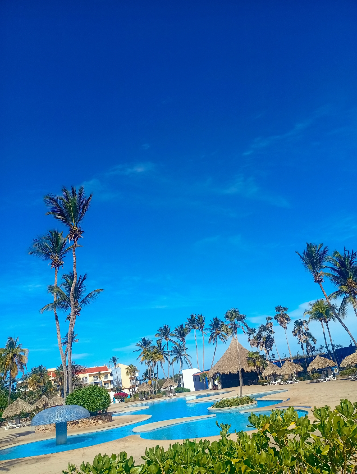 The image depicts a tropical scene in Playa El Agua, Venezuela. The foreground features lush green foliage with a swimming pool complex characterized by irregular, lagoon-like shapes and a mushroom-shaped water feature covered in blue mosaic tiles. Several palm trees frame the scene, reaching towards a clear, bright blue sky with faint cirrus clouds. In the background, there is a multistory building with orange details, possibly a hotel or resort, and small thatched-roof structures, likely cabanas or shade coverings. There are white lounge chairs in the cabanas. There are no people immediately visible in the scene. The setting suggests a relaxing, vacation atmosphere.