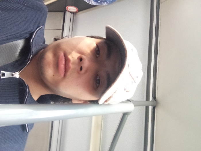An individual, identified as a young adult male, is depicted in a close-up, frontal self-portrait within what appears to be the interior of a public transport vehicle