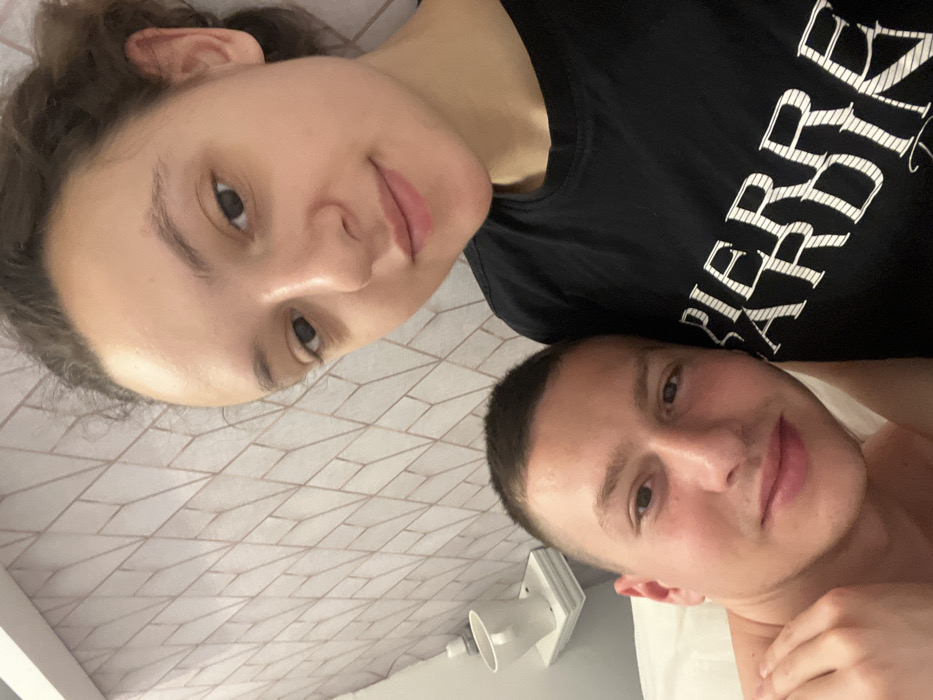 An indoor close-up photograph captures two young adults in what appears to be a private residence or hotel room