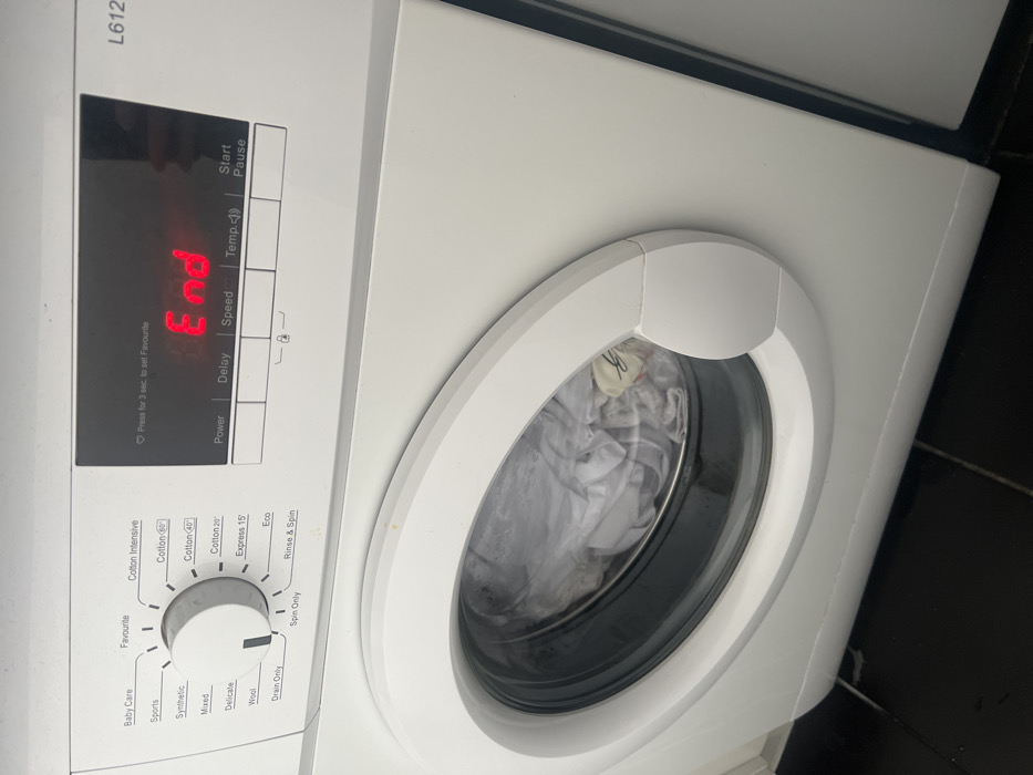The image depicts a white, front-loading washing machine in an indoor setting. The machine's control panel is visible at the top, featuring a large circular dial for program selection, currently set to "Spin Only." A digital LED display shows the red text "End," indicating the completion of a cycle. Buttons for "Power," "Delay," "Speed," "Temp," and "Start Pause" are arranged below the display. A model number "L612" is partially visible on the upper right of the control panel. Through the transparent door, white laundry items, including what appears to be a light-colored garment with a small tag, are visible within the drum. The washing machine rests on a dark-colored, possibly black tiled, floor. No visual elements within the image provide information to determine its specific location within the city of London, United Kingdom, or any other geographical area.