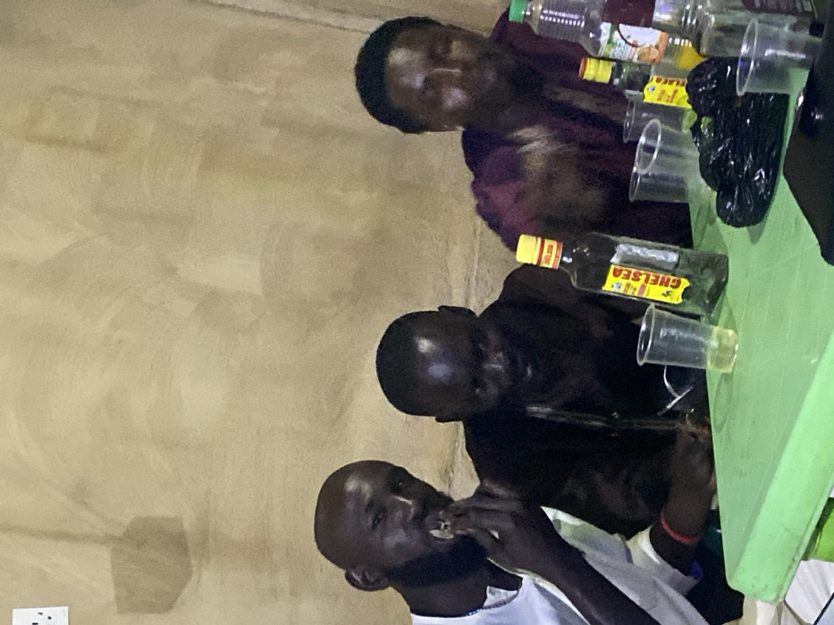 Three men are sitting at a green table with several bottles and clear plastic cups. One man is eating. Another is wearing a burgundy shirt. Bottles on the table have labels and yellow caps. A black plastic bag sits at the end of the table. The image appears to be taken indoors, with a plain wall in the background. There's an electrical outlet visible at the bottom left corner.