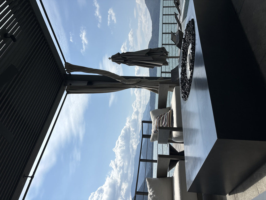 An outdoor patio with covered seating overlooks a scenic vista of water and mountains under a blue sky filled with fluffy white clouds. The patio features modern furniture, including chairs with cushions, a closed parasol, and a fire pit. The architecture has a contemporary design with sleek lines and dark framing. The scene evokes a sense of luxury and relaxation.