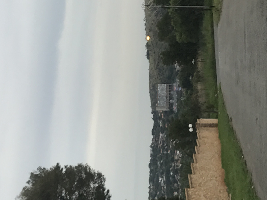 A hazy day shows a cityscape extending up a hill. A large building is seen near the hilltop, below a light source. The viewer's perspective is from a slightly elevated position, with a paved road and a tiered stone wall in the foreground. A large tree is visible on the lower left. The scene gives a sense of looking down upon a densely populated area, ascending the terrain.