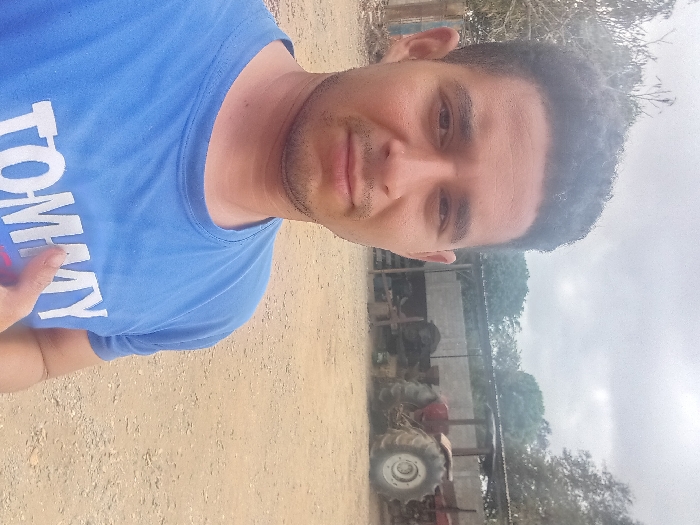 The image captures an adult male taking a selfie outdoors in a rural or industrial yard within Cujisal, Venezuela, under an overcast sky