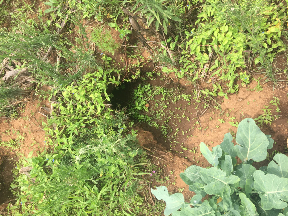 The scene depicts an overhead view of an outdoor plot of reddish-brown tilled soil located in Limuru, Kenya. A dark, circular subterranean opening, approximately 20-25 cm in diameter, is visible in the upper-center of the frame, consistent with an animal burrow. This opening is surrounded by various green plants of differing sizes. In the bottom-left quadrant, several large, broad, dark green leaves of a cultivated brassica plant are prominent. The ground surface features a mixture of exposed reddish-brown soil and diverse green vegetation, including small sprouts, leafy groundcover, and taller, slender plants. Some of these taller plants bear small white or blue flowers. Scattered dry plant debris and broken stalks are present on the soil surface. No human individuals or specific animal interactions are depicted.