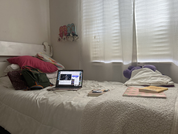 The image displays an unmade bedroom, located within a private residence in Apodaca, Mexico. A white-sheeted bed with a white headboard occupies the left and central portions of the frame. Against the headboard are stacked multiple pillows, including a large pink pillow and a smaller patterned one. A green backpack, featuring a visible rainbow-striped strap, rests on a patterned maroon object at the foot of the stacked pillows. A silver-toned laptop is open on the bed, its screen displaying what appears to be a video player interface, possibly from a social media platform. To the immediate right of the laptop are two small, stacked books or notebooks. Further right on the bed, positioned on a white textured throw blanket, are a pink notebook with a light green pattern and a yellow book titled "LEMONADE." In the upper right corner of the bed, a purple stuffed animal is partially visible, covered by a white garment. A large window on the right side of the room is covered by two white pleated blinds, providing diffused natural light. Wall decorations include mounted pink and turquoise flip-flops with bows, and a small white bow, situated on the wall above the headboard. No individuals are present within the scene.