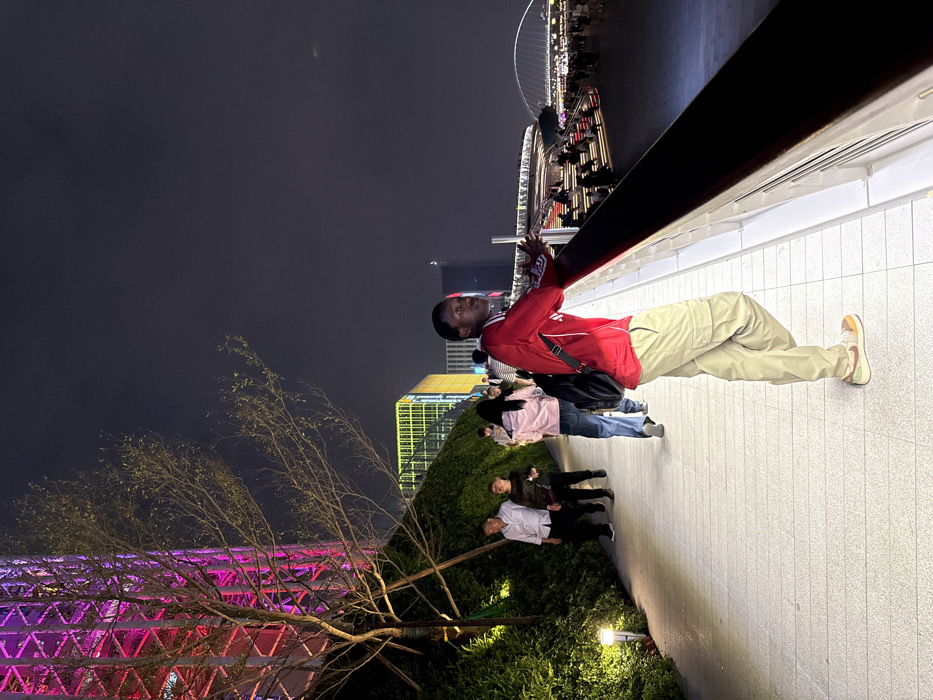 The image captures a nighttime urban scene in Haizhu District, China, set on a pedestrian promenade. A young male, positioned in the right foreground, stands on a light-colored tiled pathway, leaning against a dark railing. He is wearing a red long-sleeved athletic shirt with white stripes on the sleeves, khaki cargo pants, and multi-colored sneakers, with a black backpack slung over his right shoulder. He looks towards the right side of the frame with a neutral expression. To the left of the main subject, several individuals walk away from the viewer along the same pathway. These include a man in a white shirt and dark pants, a woman in a dark top and dark pants, and another woman in a pink jacket and blue jeans. The pathway is bordered on the left by green landscaping with small trees and shrubs, illuminated by square ground-level lights. Behind this greenery, a tall, modern building with a geometric facade glows vibrantly with pink and purple illumination. Further back, another building displays yellow-grid lighting. To the right of the main subject and beyond the railing, a wide, open area or plaza is visible, featuring stepped seating populated by numerous distant figures. In the far distance, a large, brightly illuminated arched bridge spans a body of water under a dark night sky. The scene is lit predominantly by artificial urban lighting.