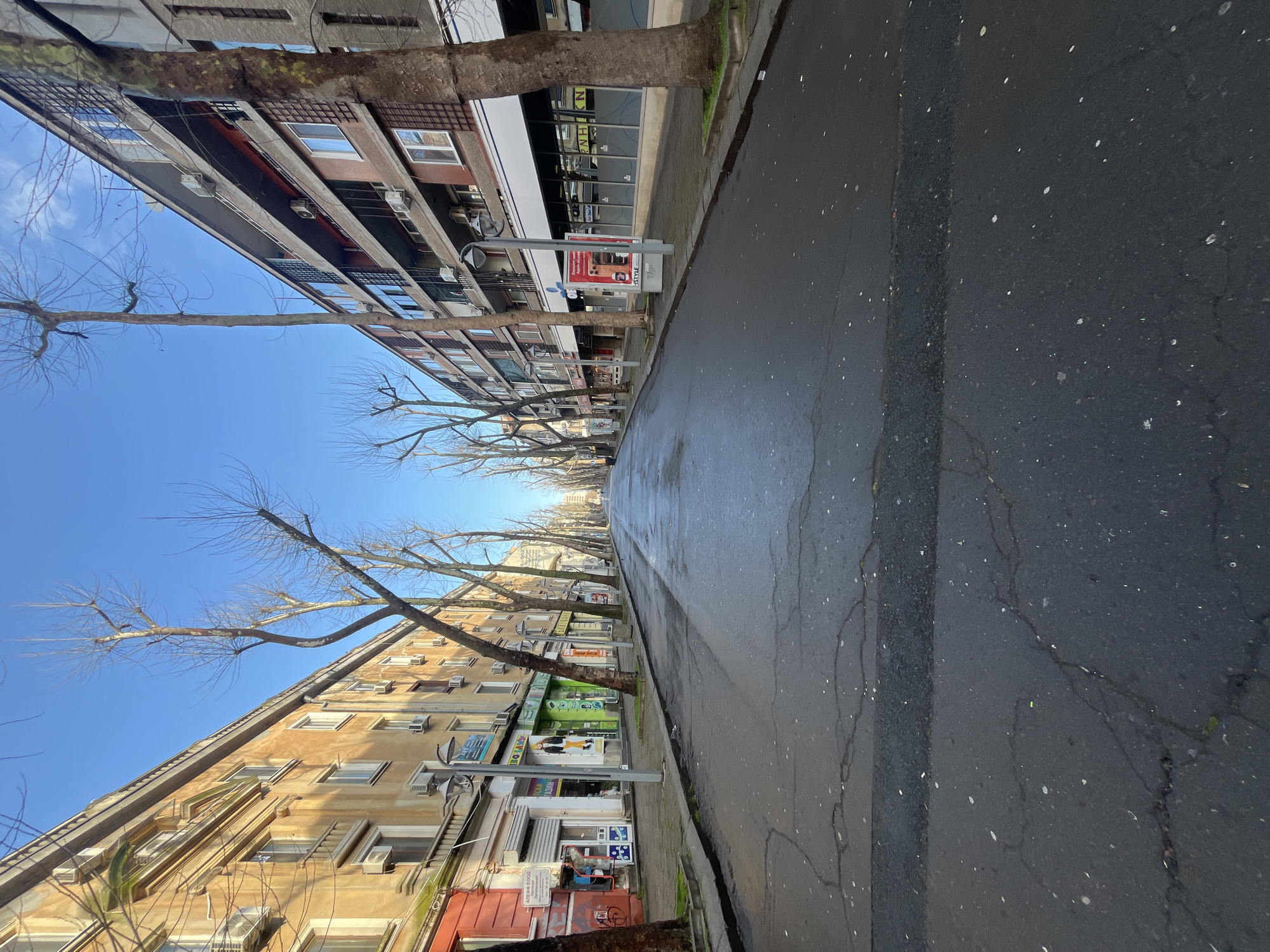 The image displays an empty urban street in Burgas, Bulgaria, captured from a low perspective looking down a straight, tree-lined thoroughfare. The asphalt road surface appears wet or damp, exhibiting multiple cracks and scattered white debris. A dark, wide horizontal band of asphalt repair is present in the immediate foreground. Multi-story buildings flank both sides of the street. On the left, an older, light brown/ochre building with numerous windows and externally mounted air conditioning units features commercial establishments at ground level. These storefronts include a red-painted unit with minor graffiti, and others displaying Cyrillic signage in colors such as white and green. On the right, a darker, brownish-grey multi-story building with balconies, numerous windows, and external air conditioning units runs parallel to the street. Its ground floor houses commercial spaces, including one with large display windows and a prominent red advertising poster featuring an Apple iPhone. Bare deciduous trees with thick trunks line both sidewalks, interspersed with traditional streetlights equipped with dual lamps. The sky above is clear and bright blue, devoid of clouds. No individuals, vehicles, or active interactions are visible in the scene.