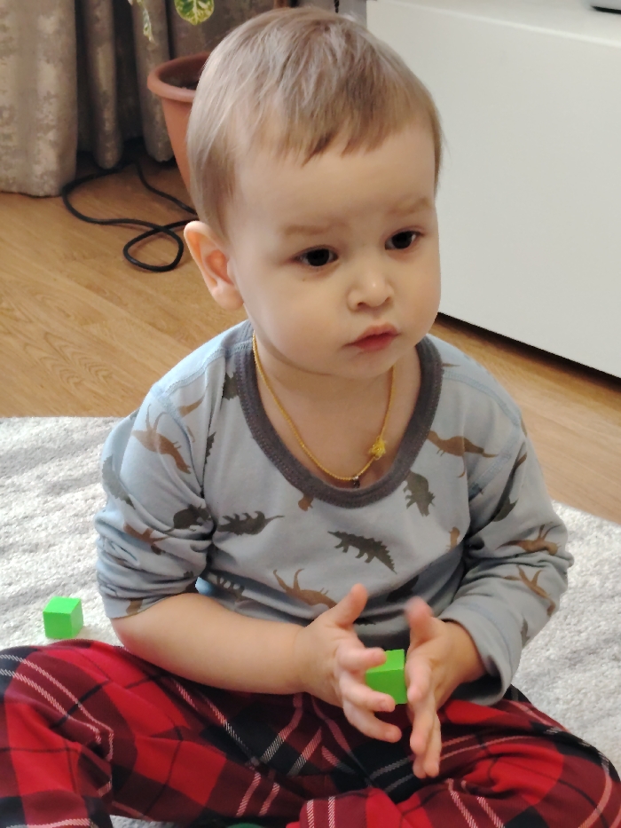 A young child sits cross-legged on a light-colored rug. The child wears a blue, long-sleeved shirt patterned with dinosaur shapes and red plaid pants. A gold necklace adorns the child's neck. Two green blocks are near the child's hands, one held between them. The background includes a brown flower pot, a white piece of furniture, and patterned curtains. The child appears to be focused or contemplative.