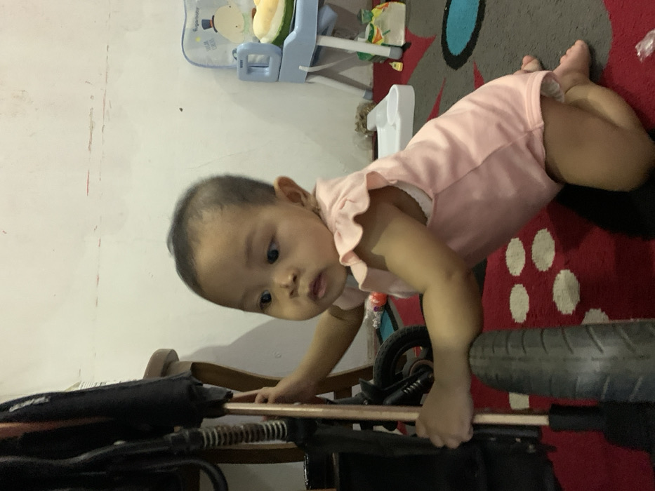 - "An infant is observed kneeling on a red patterned area rug with white and blue accents, located indoors within Kecamatan Pati, Indonesia" by FM-jFYoF3, licensed under CC BY 4.0